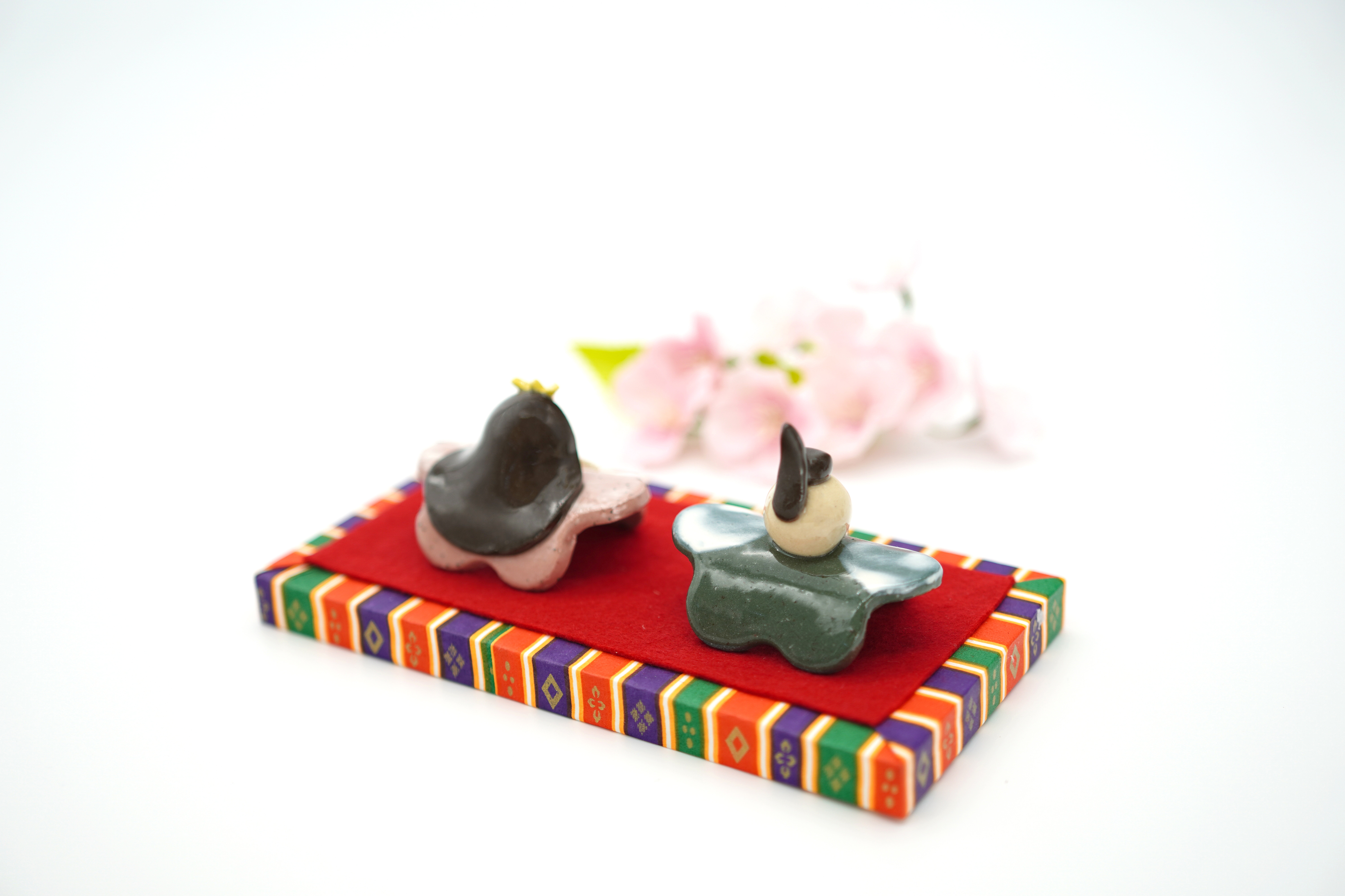花型を丸めて作った、ちいさい陶器のひな人形です。