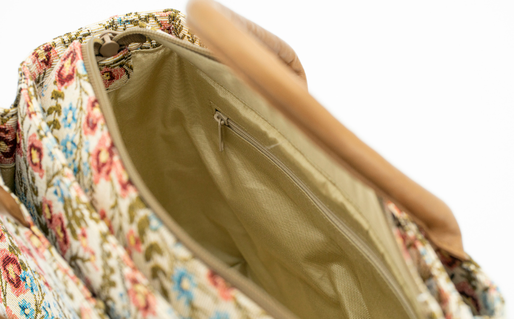 ゴブラン織り柄入りのトートバッグです。 両面に幅いっぱいのポケットがあり、ポケットに持ち手を付けることで ポケットが開く心配もなく、使い勝手の良いバッグに仕上がっています。 ポケット部には、オランダから輸入したゴブラン織りのかわいい柄を差し込みました。 艶のある絹とゴブラン織りの柄生地がよく合っています。 <ポイント> ・口はファスナー ・胴部の両面にオープンポケットあり ・内袋の両面にポケットあり (ファスナーポケット・スマートフォンが入る打ち付けWポケット)