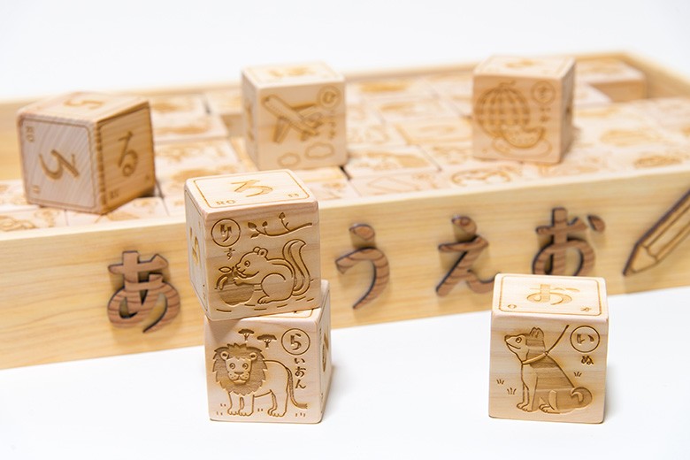 形の認識や手指の動きの発達にもつながる〈ポットンつみき〉、集中力や記憶力を育む〈ベビーそろばん〉、6面キューブにイラストやひらがな刻印された〈あいうえおつみき〉、楽しく英語と触れ合える〈ABCつみき〉。