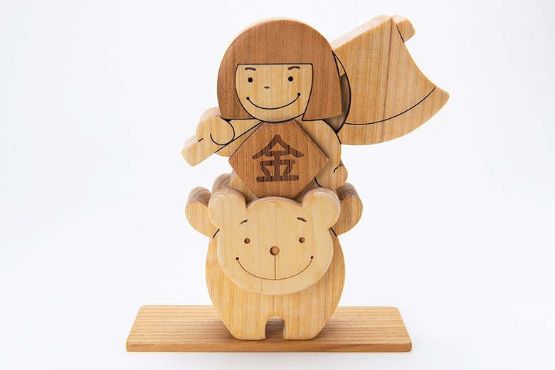 まさかり(斧)をかついだ金太郎さんが大きなクマに乗って出発!