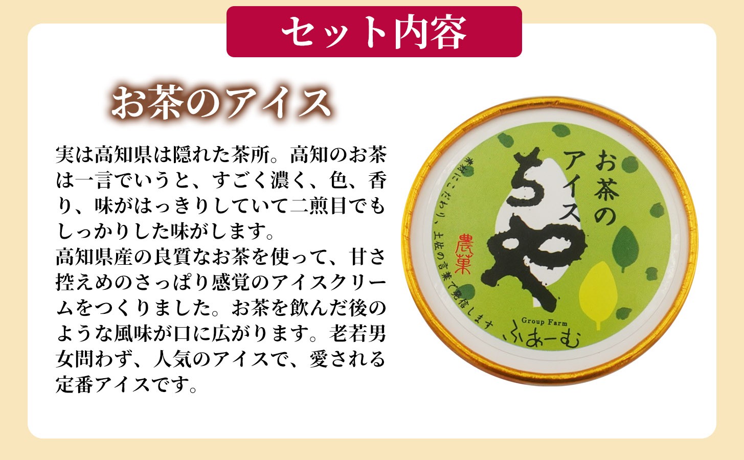 高知県産の良質なお茶を使って、甘さ控えめのさっぱり感覚のアイスクリームをつくりました。