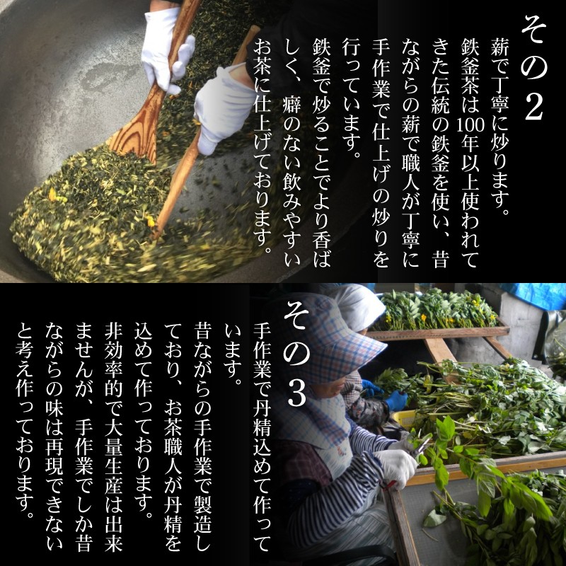 全国で一番人口の少ない(離島を除く)高知県大川村で曾祖父の代から受け継がれてきた100年以上の歴史がある鉄釜を使い、伝統の製法で手作業で炒ることで、懐かしくほっとするような香ばしく飲みやすいお茶になっているかと思います。
