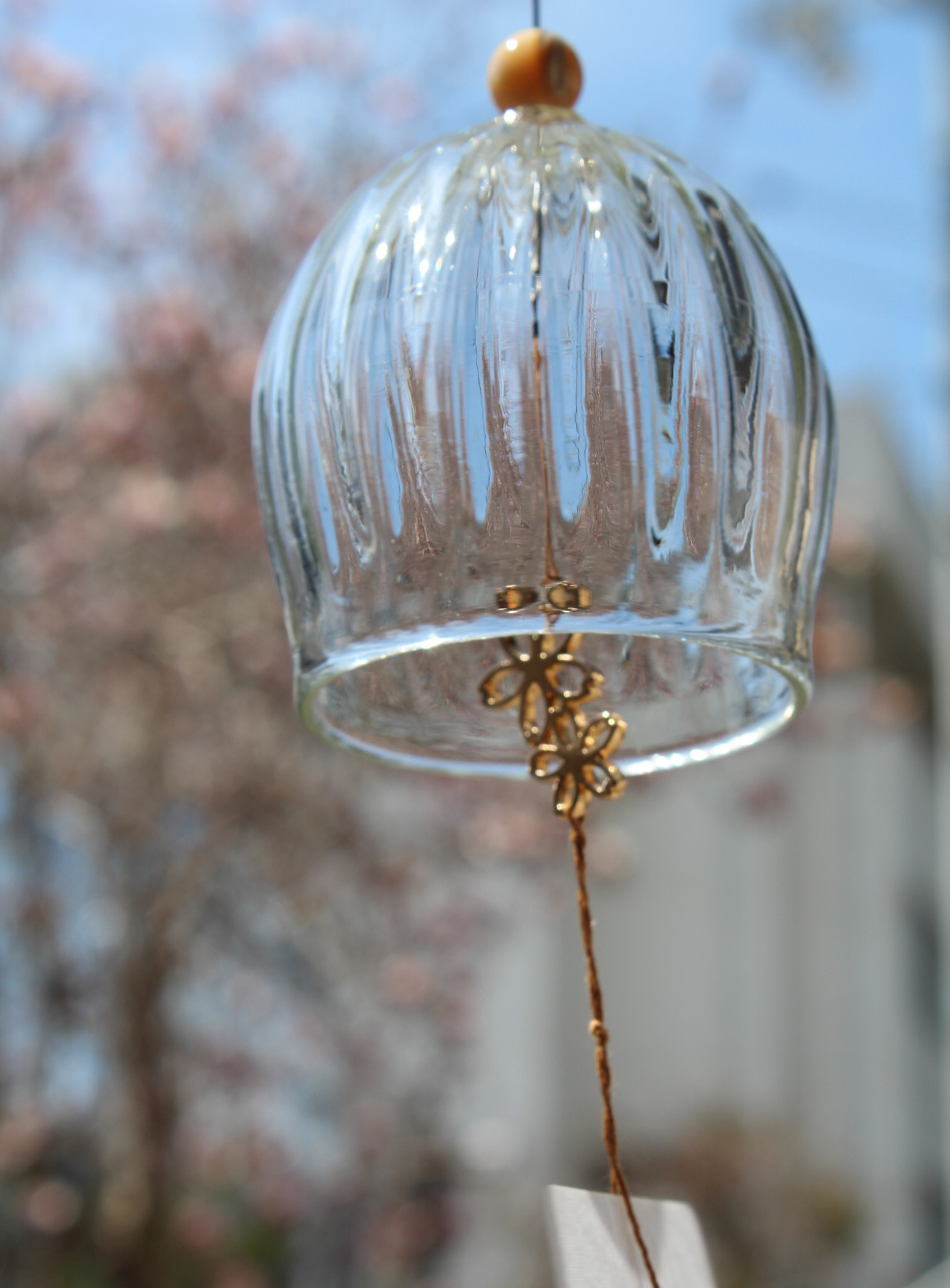 ガラス風鈴「海つ音」(わたつね)丸型・桜は、風鈴を鳴らす金具(舌)に桜の花の形の金属を組合わせています。