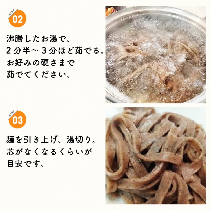 沸騰したお湯で2分ほど茹でます。柔らかめの麺がお好きな方は麺をよくほぐした状態で2分半~3分ほど茹でてください。