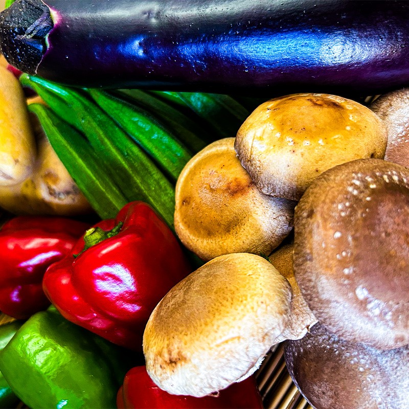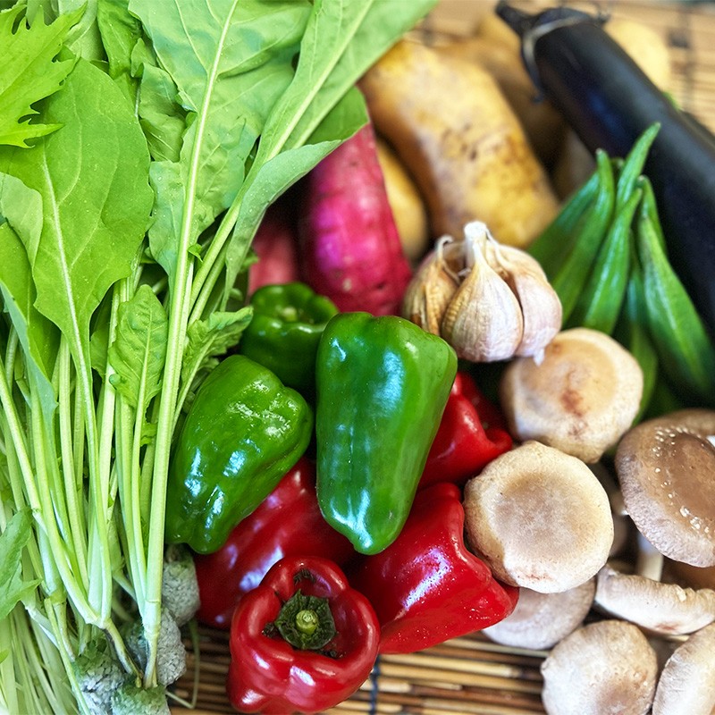 新生姜、空芯菜、サニーレタス、水菜、小松菜、モロヘイヤ、バジル、おくら、なす、きゅうり、トマト、ミニトマト、ししとう、甘長とうがらし、枝豆、里芋、赤紫蘇