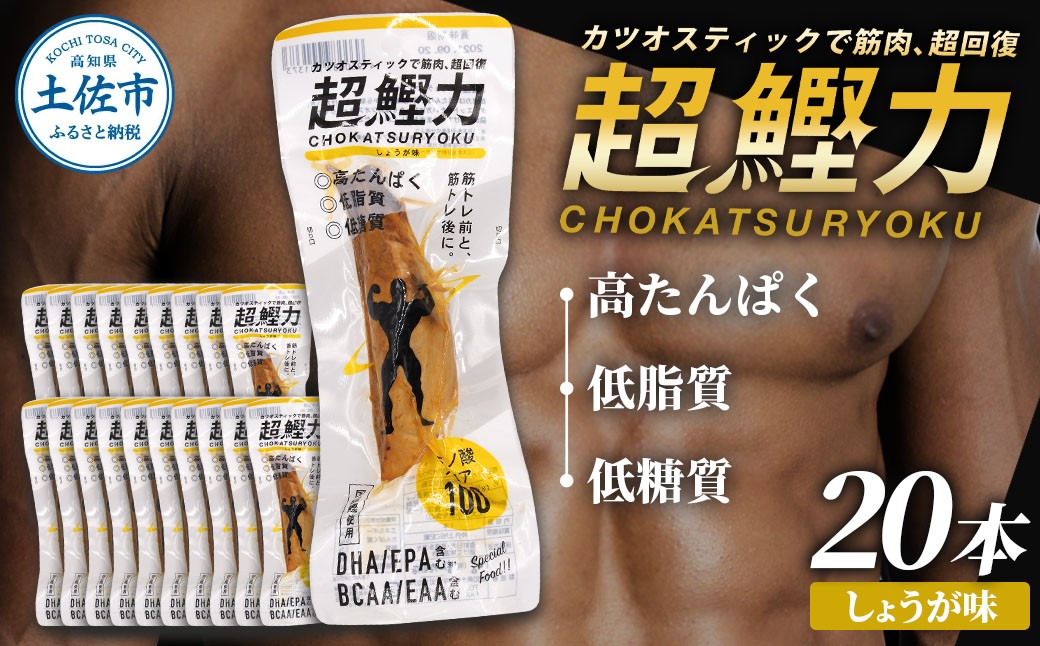 超鰹力 しょうが味 20本入り 鰹 カツオ かつお 国内産 カツオスティック 生姜味 高たんぱく質 低脂質 筋トレ ダイエット 健康 食品 常温配送 そのまま 簡単 料理 サラダ 簡易梱包 大量 保存食 常備食