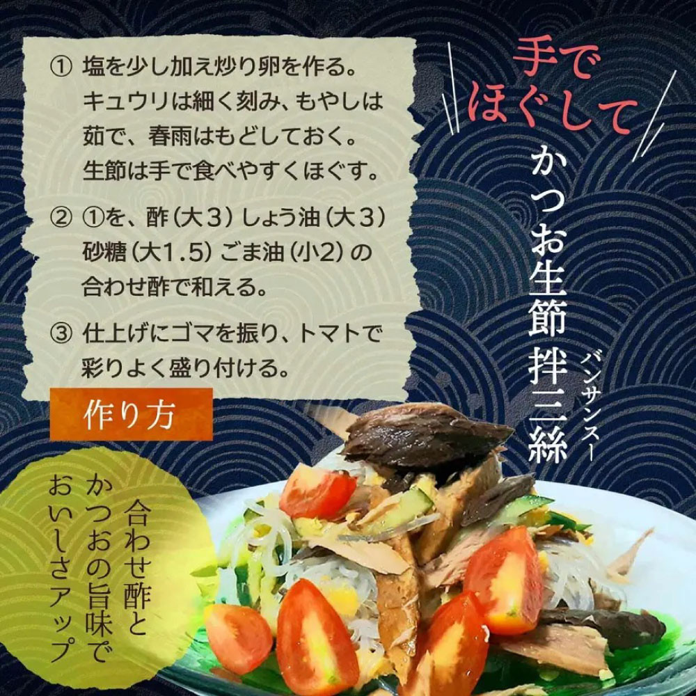 かつお生節は鮮度が重要で、1日で仕上げられた柔らかい製品です。真空包装されており、開封後は冷蔵保存が必要です。包丁やナイフで簡単に切れ、ご飯のおかずや酒の肴として楽しめます。おすすめの食べ方は、マヨネーズ、醤油、七味唐辛子を添える方法で、野菜を加えてサラダ感覚で楽しむことも可能です。ゆずを絞れば土佐らしい風味が楽しめます。保存の際は切断面が乾燥しないようタッパーやラップを使用してください。