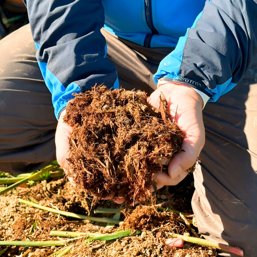 さらに、私たち『やの一果彩』では、特別な栽培環境を整えています。有機肥料や木の皮、堆肥、ミネラル豊富な貝化石を使用した独自の土壌づくりに加え、特殊な菌根菌を培養して根に寄生させることで、微量要素(鉄や亜鉛、マンガンなど)とミネラル(カルシウムやマグネシウム、カリウムなど)を効率よく吸収させています。さらに潅水にはナノバブル水を活用し、土壌の栄養素を余すことなく生姜に取り込ませることで、他を凌駕する濃密な栄養価と豊かな風味を実現しました。