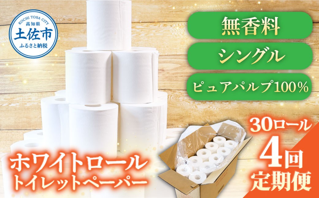 高知県土佐市の美しい自然に育まれた、環境と人にやさしいトイレットペーパーです。 トイレットペーパー ホワイトロールシングル ピュアパルプ 無香料 業務用 30ロール 定期便 4回定期便 天然パルプ100% 無地 日本製 柔らかい トイレ ペーパー 日用品 消耗品