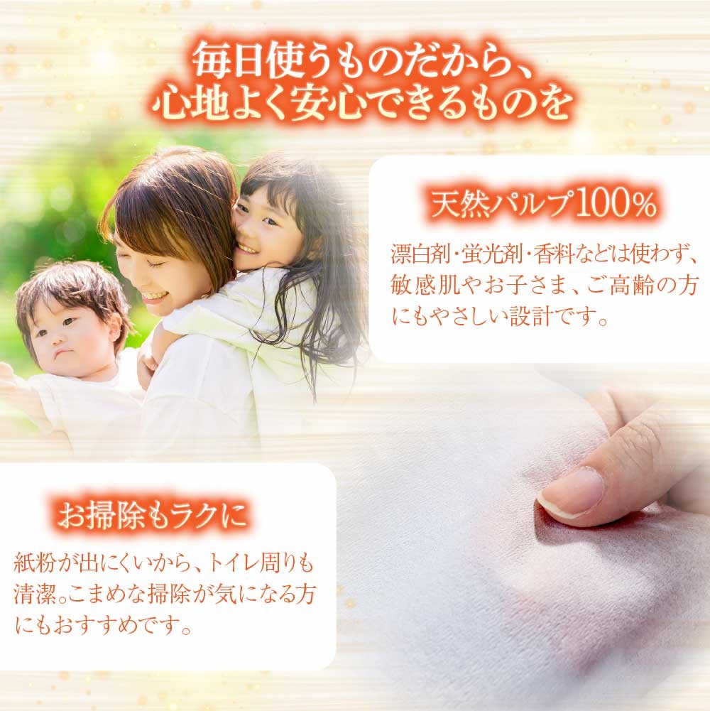 高知県土佐市の美しい自然に育まれた、環境と人にやさしいトイレットペーパーです。本商品は、土佐市の名水・仁淀川の伏流水を使用し、丁寧に透き上げたシングル60メートル巻の高品質トイレットペーパーです。製造は一貫して国内で行い、素材から製法までこだわり抜いた安心の日本製。パルプは、繊維が長く柔らかな仕上がりが特長の針葉樹由来の天然パルプ100%を使用しています。漂白剤や蛍光剤、香料などの化学物質を使用していないため、肌の敏感な方や小さなお子さま、ご高齢の方にも安心してお使いいただけます。