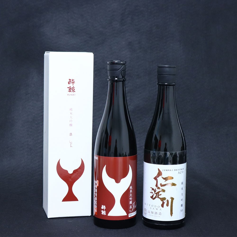 | 容量 | 仁淀川純米大吟醸50%AC-95:720ml×1本 酔鯨純米大吟醸40%丞:720ml×1本 上記2品を緑色2本箱に入れて発送 重量:3kg弱 |