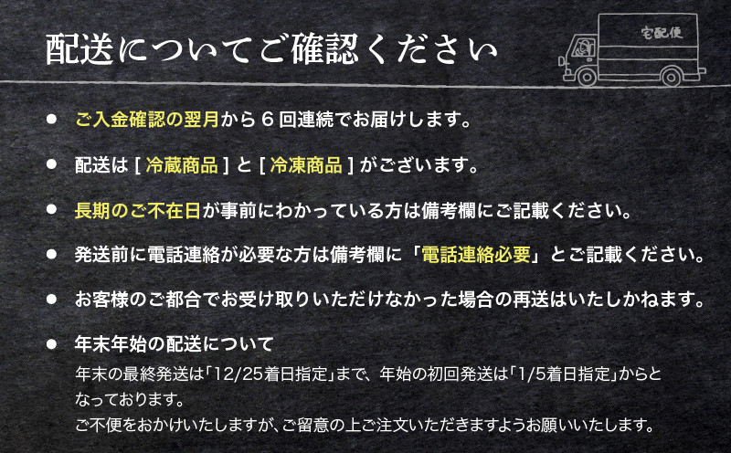 入金確認後、翌月から発送開始。 6回連続でお届けします。 ■年末年始の配送について■ 年末の最終発送は「12/25着日指定」まで、 年始の初回発送は「1/5着日指定」からとなっております。 寄附者様にはご不便をおかけいたしますが、ご留意の上ご注文いただきますようお願いいたします。 ※発送前に電話連絡が必要な方は備考欄に「電話連絡必要」とご記載ください。 |