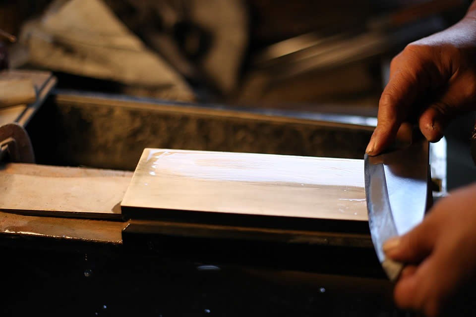 また、迫田刃物の特長である「手砥ぎ仕上げ(一般的には本刃付けと言います)」は、3段階の手作業での砥ぎ仕上げ、時間はかかりますが切れ味が全く違う包丁に仕上がっております。