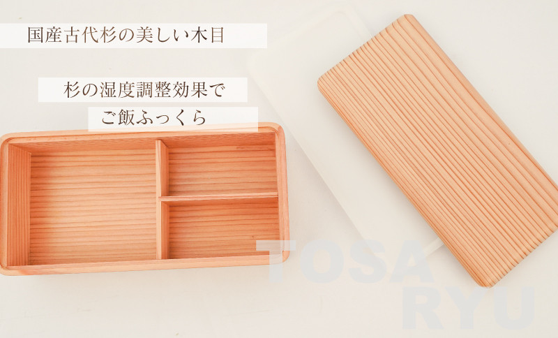 古材杉弁当箱: 樹齢200年以上の杉材を使用しており、ほのかな香りと、ご飯の湿度調整によりお弁当の味を引き立てます。