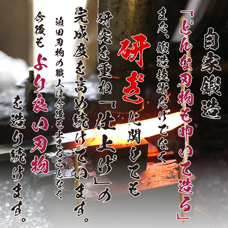 日本刀を作る技術から生まれた秘伝の自由鍛造を引き継いだ、400年の伝統技法を受け継いだ包丁専門工房「迫田刃物」では、