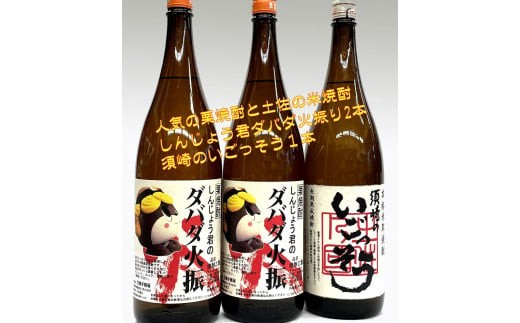 大人気栗焼酎しんじょう君の「ダバダ火振しんじょう君ラベル」2本と本格米取焼酎「須崎のいごっそう」1本の一升瓶3本セットです。 須崎市のご当地キャラクター「しんじょう君のダバダ火振」 当店オリジナルラベル。 土予(高知・愛媛)県境は栗の大産地。 栗のまろやかな香りを大切に、低温でゆっくり蒸留しました。 「須崎のいごっそう」は名醸造司牡丹で醸造した本格米取焼酎です。 米の豊かな香りをお楽しみください。 「いごっそう」とは土佐弁で「頑固者」の意。昔ながらのこだわりの地焼酎です。 ※お酒は20歳になってから。20歳未満の方は酒類のお申込みはできません。 ※妊娠中や授乳期の飲酒はお控えください。 提供:酒のとくひさ