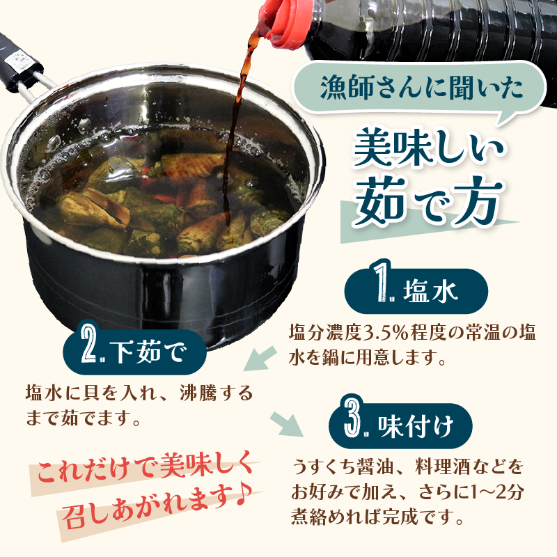 ((注意))茹で過ぎると身が取れにくくなります。必ず塩水に貝を入れてから火にかけてくださいね。