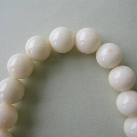 黄みをおびた色目の天然ミッド珊瑚です。よく見るとほんのりピンクがかった物もある可愛い数珠です。