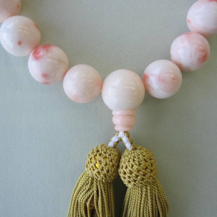 | 容量 | ピンク珊瑚(カラーグレード:1~3)主玉:約14mm~15mm玉、 天玉:約9.8mm 2個、親玉(三つ穴):15.7mm、頭付房:正絹(からし色) |