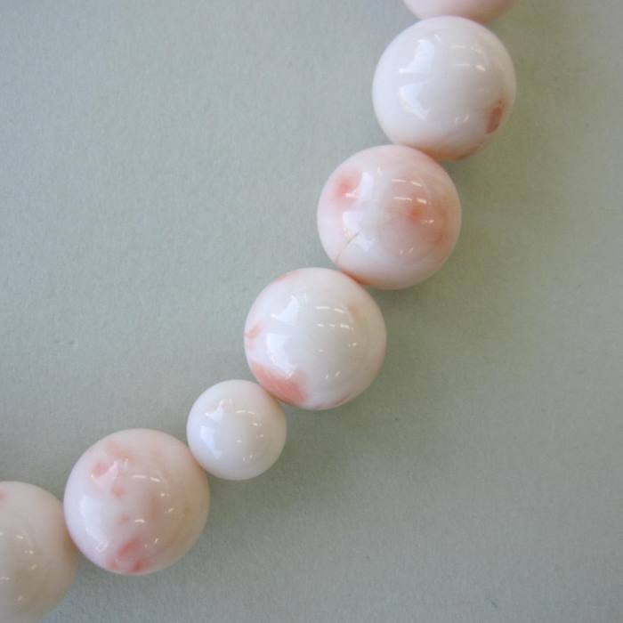 白地にピンクの斑紋が美しい、大変大粒の深海(ピンク)珊瑚の数珠。