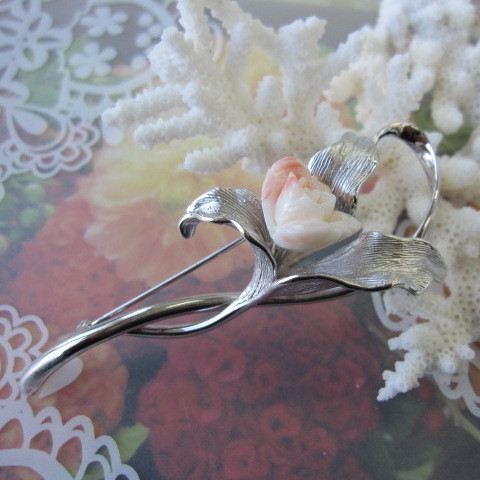 シルバーの上品なデザインに、可憐なバラがポイントのブローチ。