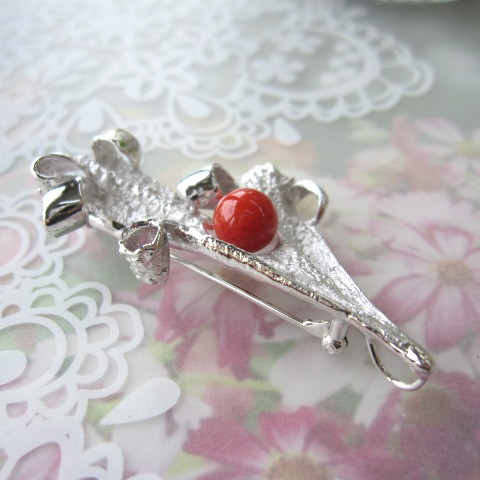 シルバーデザインに、「あか」サンゴがポイントのお洒落なブローチ。