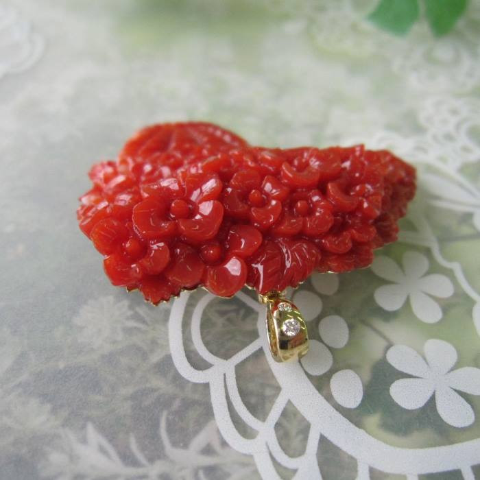| 容量 | 高知産赤珊瑚(カラーグレード:3.5):約39mm×47.7mm、厚さ:約8.6mm、ダイヤモンド:0.03ct、金具:K18(ブローチ兼ペンダント)裏張り、重さ:18.0g |