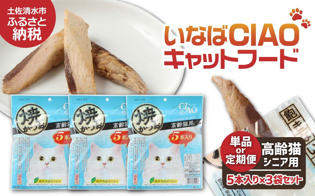 歯の弱った高齢猫のために作った、水分を多めに仕上げた柔らかい焼かつおです。 シニア猫用キャットフード いなば チャオ・焼かつお(1種類5本入×3袋セット)選べる単品・定期便 ペットフード 高齢猫 猫 ネコ スティックタイプ 消臭 カツオ 魚肉 おやつ ごはん ご褒美 安心 国産品【R00042-1】