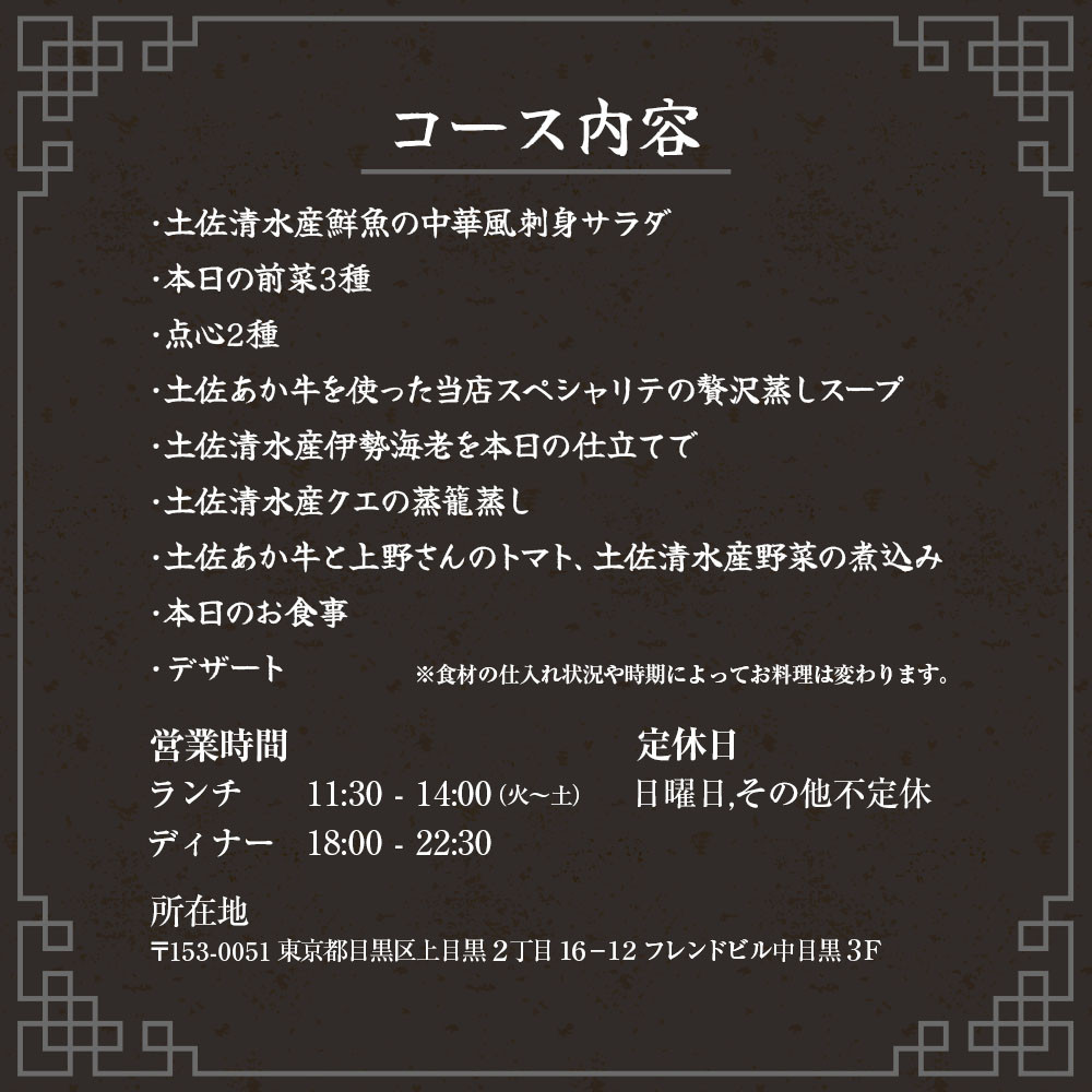 | 容量 | ■コース内容 提供店舗:中国菜灯菜 ・土佐清水産鮮魚の中華風刺身サラダ ・本日の前菜3種 ・点心2種 ・土佐あか牛を使った当店スペシャリテの贅沢蒸しスープ ・土佐清水産伊勢海老を本日の仕立てで ・土佐清水産クエの蒸籠蒸し ・土佐あか牛と上野さんのトマト、土佐清水産野菜の煮込み ・本日のお食事 ・デザート ※食材の仕入れ状況や時期によってお料理は変わります。 ●【お飲み物ほかその他のメニュー】 上記以外のメニューは、別途店舗での精算となります。 ●営業時間 ・ランチ:11:30 - 14:00 火曜日~土曜日 ・ディナー:18:00 - 22:30 ●定休日 日曜日,その他不定休 ●アクセス 東京都目黒区 最寄り駅:中目黒 ※徒歩4分 |