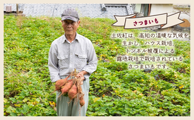 土佐紅は、高知の温暖な気候を生かし、ハウス栽培の他、トンネル被覆による露地栽培で栽培されているサツマイモです。