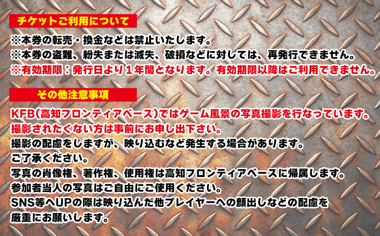 | 容量 | ■平日定例会チケット×1枚(1日分) ※1名分 ※未成年(18歳未満)の場合は保護者同伴または保護者承諾書が必要 ※『U-18サバゲー』時は10歳(小学4年生)から参加いただけます ※有効期限:発行日より1年間となります。有効期限以降はご利用できません |