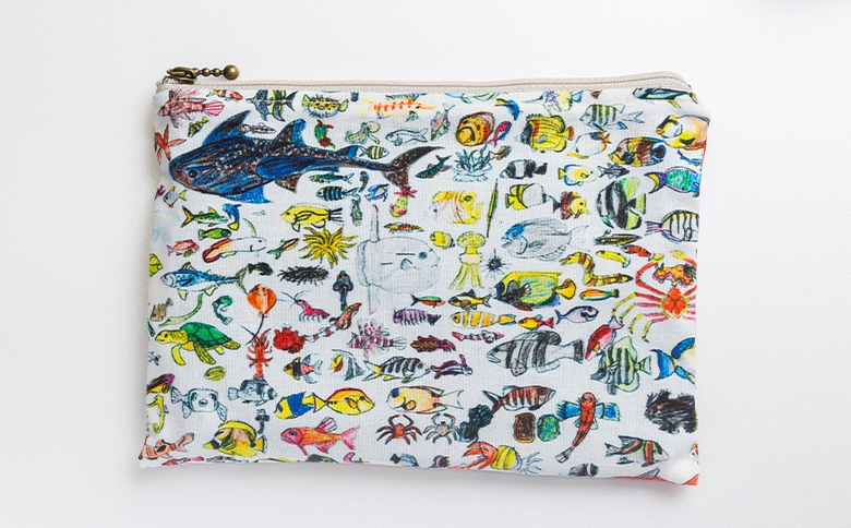 将来画家を目指す香南市の学生、【後藤偉地】くんが描いた魚の絵がモチーフの、かわいくカラフルなデザインが印象的な文具やポーチなどの雑貨セットです。
