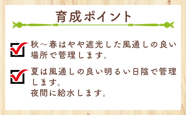 植物のため、個体差やお申込み時期によって大きさ等が異なりますのでご了承ください。
