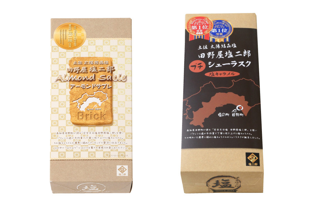 | 容量 | ・田野屋塩二郎プチシューラスク 10枚入り×2箱 ・田野屋塩二郎アーモンドサブレ・ブリック 15枚入り×2箱 【原材料名】 ●プチシューラスク マーガリン(国内製造)、卵、アーモンドスライス、乳等を主要原料とるす食品、小麦粉、砂糖、牛乳、塩、こんにゃく粉加工品(粉あめ、こんにゃく粉)/トレハロース、乳化剤、香料、乳清ミネラル、アナトー色素、(一部に乳成分・卵・小麦・大豆・アーモンドを含む) ●アーモンドサブレ・ブリック 小麦粉(国内製造)、バター、粉糖、アーモンドスライス、加糖卵黄、マーガリン、乳等を主原料とする食品、砂糖、塩、卵、牛乳、こんにゃく粉加工品(粉あめ、こんにゃく粉)/ トレハロース、乳化剤、乳清ミネラル、香料、アナトー色素、(一部に乳成分・卵・小麦・大豆・アーモンドを含む) |