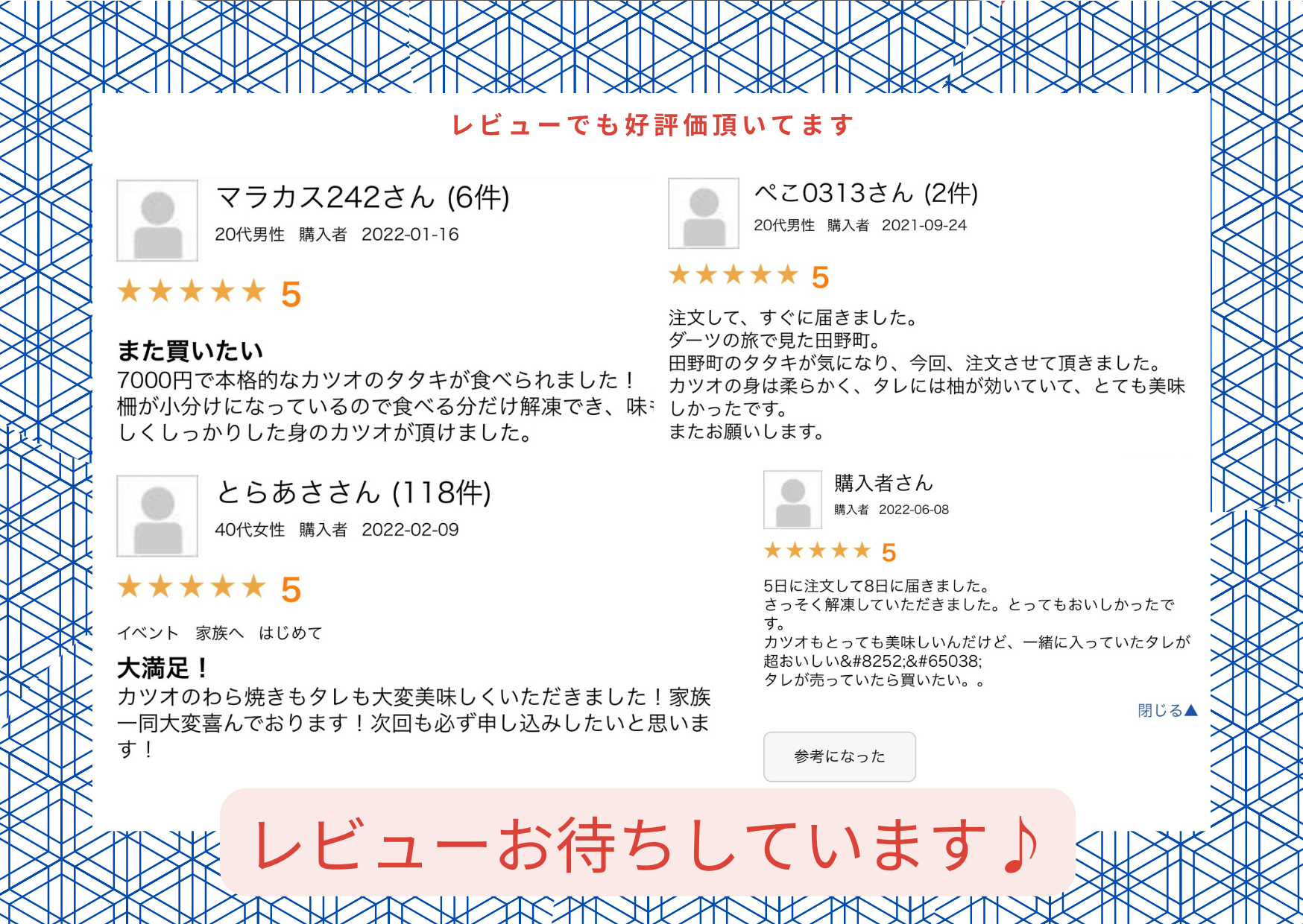 田野町のカツオのタタキのファンです。とにかく届くのが早いです。高知のタタキの香りがたまりません。またなくなったらお願いします。