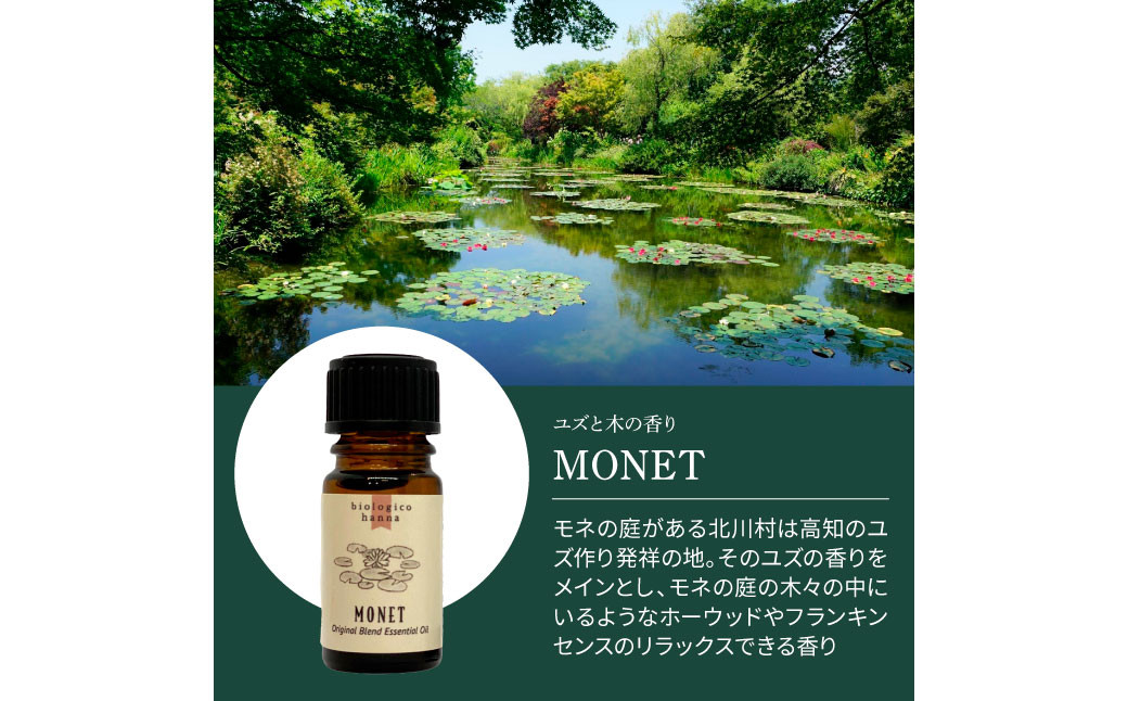 《MONET》モネの庭がある北川村は高知のユズ作りの発祥の地。そのユズの香りをメインとし、モネの庭の木々の中にいるようなホーウッドやフランキンセンスといったリラックスできる香り