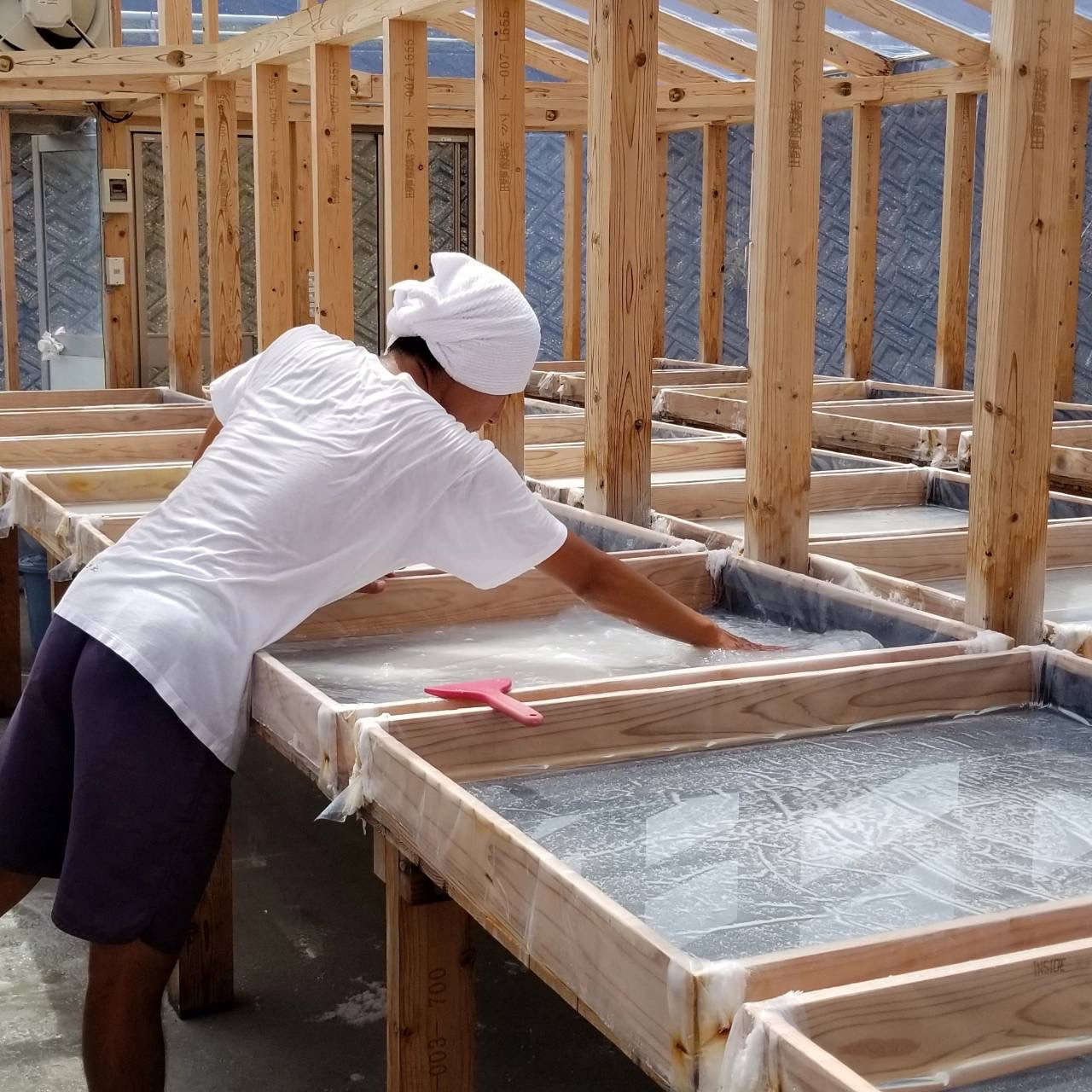 夏には60℃を超える製塩ハウスの中で、一日に幾度も攪拌作業を繰り返し、いくつかの季節を超え、ゆっくりと結晶化させていきます。
