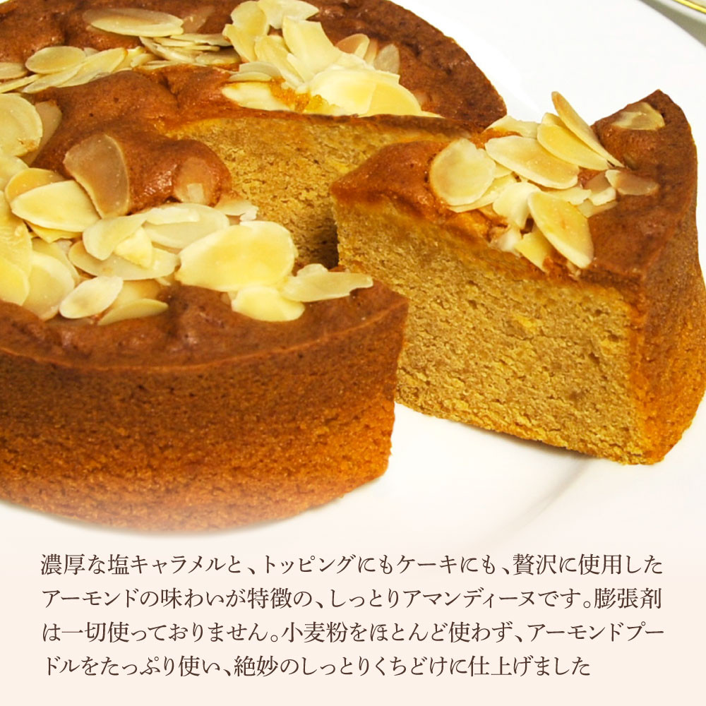 濃厚な塩キャラメルと、トッピングにもケーキにも、贅沢に使用したアーモンドの味わいが特徴の、しっとりアマンディーヌです。膨張剤は一切使っておりません。小麦粉をほとんど使わず、アーモンドプードルをたっぷり使い、絶妙のしっとりくちどけに仕上げました。