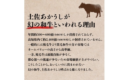 土佐あかうしは「幻の和牛」とも呼ばれ高知県内でのみ飼育されている希少な和牛です。 赤身の美味しさに特徴があり、熟成された赤身には旨みや甘みがたっぷり。 噛んだ瞬間から肉の旨みがじゅわ~っと口の中に広がります。 濃厚でありながら重すぎず、いくらでも食べられる絶品です。 ※数量限定の商品となります。 ※土佐あかうしをご希望の場合、着日の指定は受けておりませんのでご了承ください。 ※土佐あかうしについては、寄付者様の都合によりお礼の品の受け取りができなかった場合、再送は行っておりません。また、返品、交換についても受付しておりませんのでご了承ください。