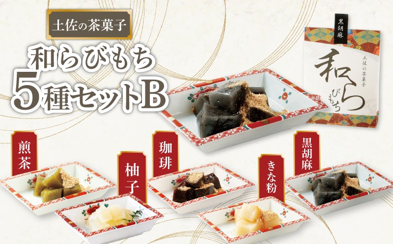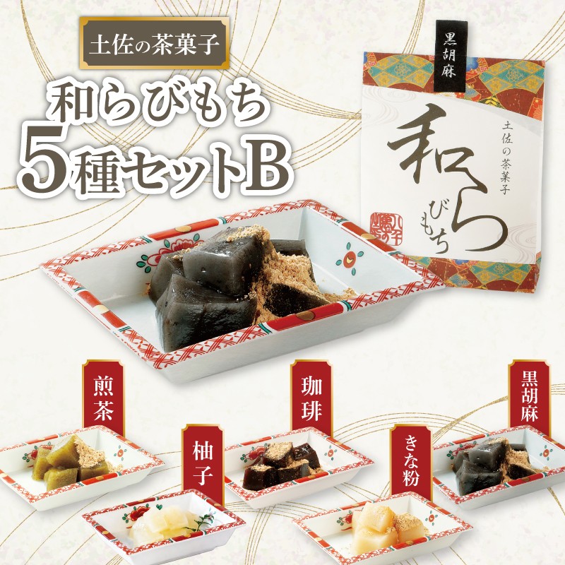 もっちり、つるり。口どけで選ばれる和菓子 土佐の茶菓子 和らびもち 5種セット B 四万十珈琲 黒胡麻 煎り黄な粉 沢渡茶 馬路柚子 わらび餅 蕨餅 わらびもち 蕨もち 本蕨粉 本わらび粉 珈琲 コーヒー きな粉 黄粉 胡麻 ゴマ 煎茶 ゆず 柚子 馬路 職人 和菓子 ぷるぷる もちもち 高知家のうまいもの大賞 安田町 KH-0002