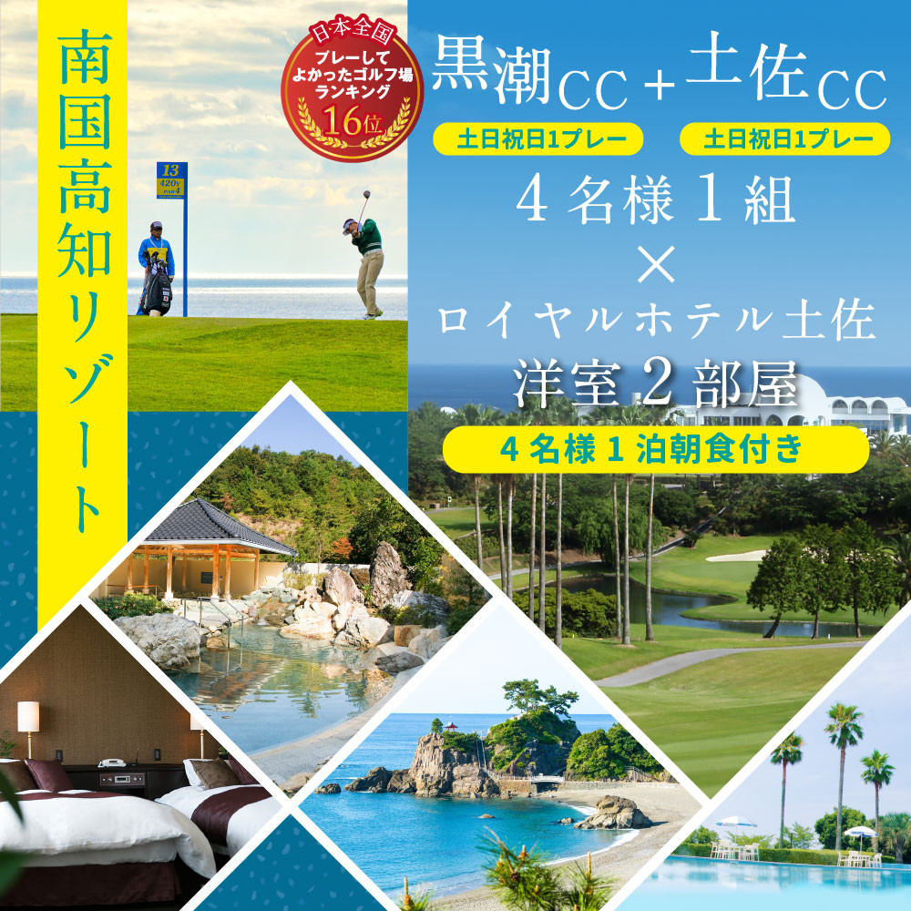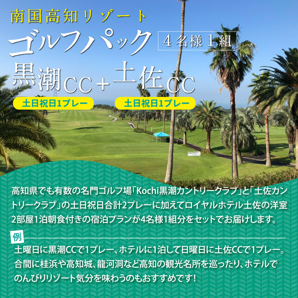 高知県でも有数の名門ゴルフ場 Kochi 黒潮カントリークラブ「土日祝日1プレー」&土佐カントリークラブ「土日祝日1プレー」と、Royal Hotel 土佐の1泊朝食付きの宿泊プラン4名様分がセットになった商品です。