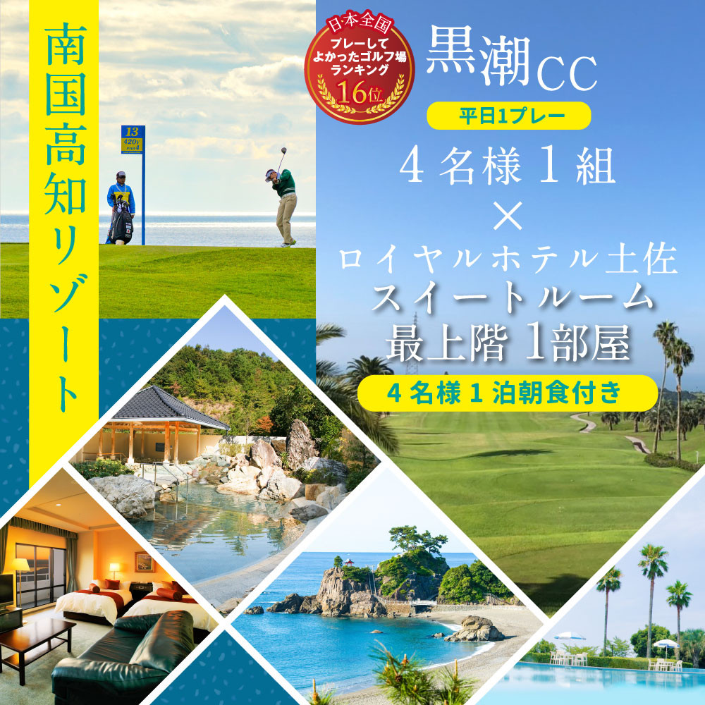 高知県でも有数の名門ゴルフ場 Kochi 黒潮カントリークラブ「平日1プレー」と、Royal Hotel 土佐の1泊朝食付きの宿泊プラン4名様分がセットになった商品です。