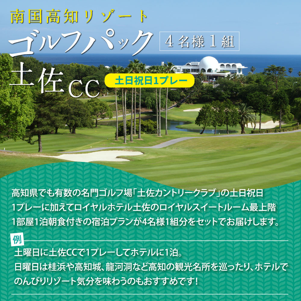 高知県でも有数の名門ゴルフ場 土佐カントリークラブ「土日祝日1プレー」と、Royal Hotel 土佐の1泊朝食付きの宿泊プラン4名様分がセットになった商品です。