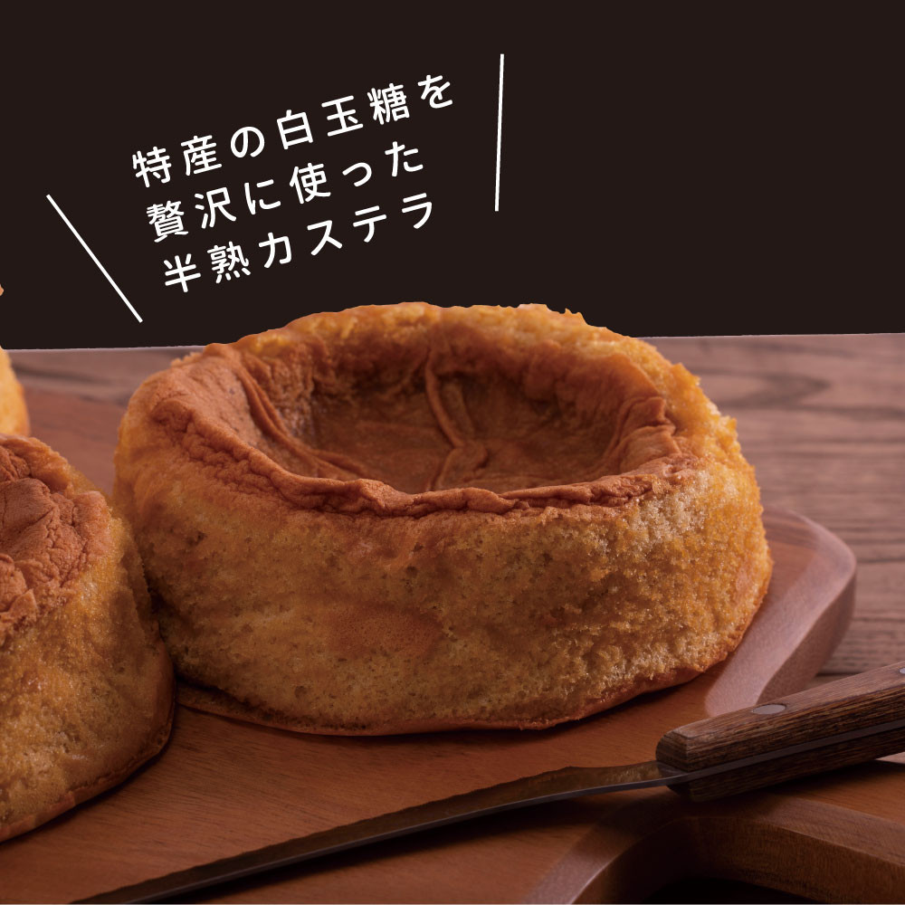 芸西村の特産である白玉糖(黒糖)を贅沢に使った半熟カステラ。なかなか半熟に焼き上げるのが難しく、幾度となく試作を重ねて完成した自信作です。外はふわふわで中は半熟、白玉糖(黒糖)の上品な甘さが引き立つ商品になっております。