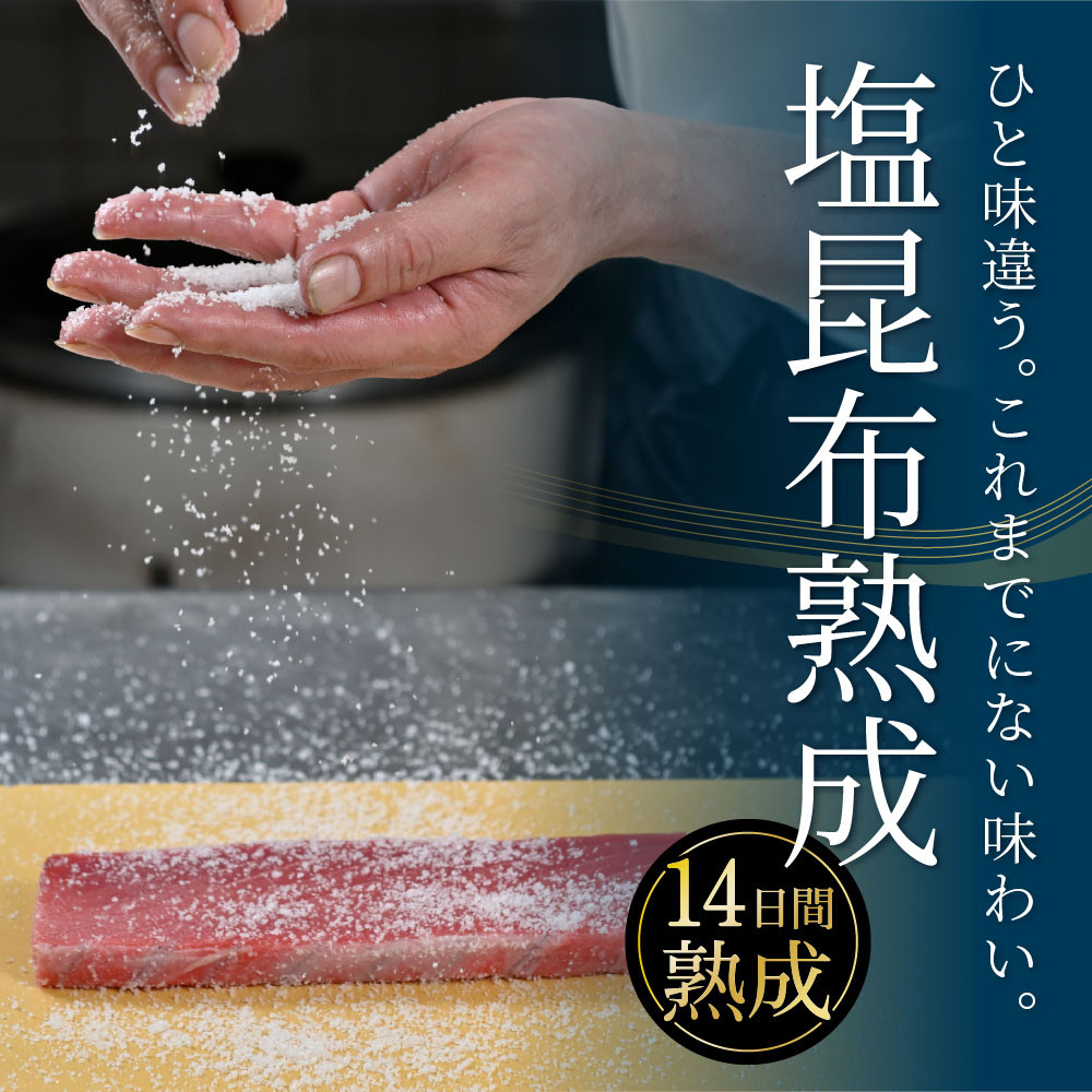 塩熟成することで適度に水分が抜けマグロの旨味を凝縮し柔らかく、昆布を巻くことでその風味が味を各段に引き上げます。