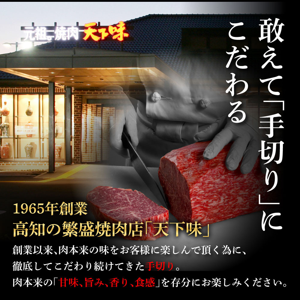 高知の老舗焼肉店“天下味”独自の「エイジング工法」を用い、食肉を腐敗させることなく、一定期間熟成させ、旨味や甘味、香りなどを凝縮。腐敗タイミングを考慮したこの見極めが肉の匠 エイジング工法:畜種、屠畜時の年齢、商品グレード(等級、脂質、赤身比率、保水性)を見極め、部位ごとに真空パックし温度0 - 1℃の貯蔵庫で管理。牛肉で15日 - 28日間を日々管理を行い、タンパク質が分解されアミノ酸等の旨味成分がしっかりと肉全体に浸透するまで出荷制限しています。これこそ“天下味”独自の強み。柔らかく美味しい食肉のご提供を実現しています。召し上がった方の笑顔を創出するために惜しみなく研鑽を積んだ老舗の味。 肉の鮮度と質を保つブライン凍結 生産者の想い 贈り物に最適!自分へのご褒美にも! (ご注意)届いた直後は、「黒ずんだ」ように見える場合がございますが、お召し上がり直前に真空パックのまま冷蔵庫等で解凍後、開封して、しばらく時間を置くとお肉本来の色に発色してまいりますので、品質には問題ございません。 【加工について】加工場所:高知市/加工工程:ウェットエイジング工法