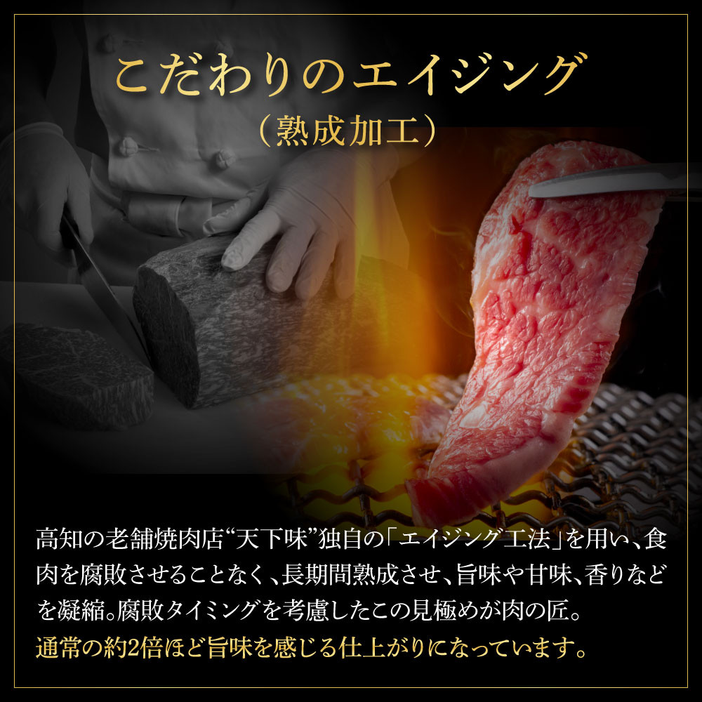 高知の老舗焼肉店“天下味”独自の「エイジング工法」を用い、食肉を腐敗させることなく、一定期間熟成させ、旨味や甘味、香りなどを凝縮。腐敗タイミングを考慮したこの見極めが肉の匠 エイジング工法:畜種、屠畜時の年齢、商品グレード(等級、脂質、赤身比率、保水性)を見極め、部位ごとに真空パックし温度0 - 1℃の貯蔵庫で管理。牛肉で15日 - 28日間を日々管理を行い、タンパク質が分解されアミノ酸等の旨味成分がしっかりと肉全体に浸透するまで出荷制限しています。これこそ“天下味”独自の強み。柔らかく美味しい食肉のご提供を実現しています。召し上がった方の笑顔を創出するために惜しみなく研鑽を積んだ老舗の味。 肉の鮮度と質を保つブライン凍結 生産者の想い 贈り物に最適!自分へのご褒美にも! (ご注意)届いた直後は、「黒ずんだ」ように見える場合がございますが、お召し上がり直前に真空パックのまま冷蔵庫等で解凍後、開封して、しばらく時間を置くとお肉本来の色に発色してまいりますので、品質には問題ございません。 【加工について】加工場所:高知市/加工工程:ウェットエイジング工法