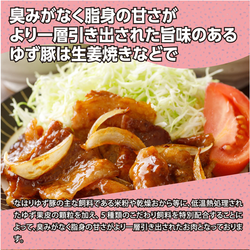 ゆず豚のしゃぶしゃぶ用は約2mmと薄いお肉ですので、鮮度をそのままお届けするために、100gずつ高機能鮮度保持フィルム包装を行い、美味しさを閉じ込めました♪柔らかさと上品な甘みをじっくりとご堪能下さい。 ◆お客様よりゆず豚は柚子の味がしますか?と良く訊かれますが、実は柚子の味は全くしないんですよ(*^-^*) ゆず豚の主な飼料である「米粉」や「乾燥おから」等に、高知県産のゆず果皮を一定量配合することによって、全く臭みがなく、お肉の甘さをより一層引き出した上品な甘みが特徴となっています。(高知県を代表するブランド豚に仲間入りをし2018年に商標登録が完了) 【こだわりの飼料】 なはりゆず豚の主な飼料である米粉や乾燥おから等に、低温熱処理されたゆず果皮の顆粒を加え、5種類のこだわり飼料を特別配合することによって、臭みがなく脂身の甘さがより一層引き出されたお肉となっております。 【こだわりの水】 なはり池里農場は、標高400mの山の頂上にあり、その標高差を利用して、ミネラルたっぷりの天然水を汲み上げ、豚達はその天然水を飲んだり、浴びたりして元気に過ごしています。 【こだわりの環境】 専門の研究者によると豚はチンパンジーと同等に賢く、実はとてもきれい好きな動物だと言われています。私達は、豚ができるだけ気持ちの良い環境で過ごせるように、肥育舎には自然免疫力を高める「おがくずの発酵床」を作って豚の健康を保持するとともに、仲間の豚と遊びまわれるストレスフリーの広い肥育舎でゆったりできる環境を保っています。