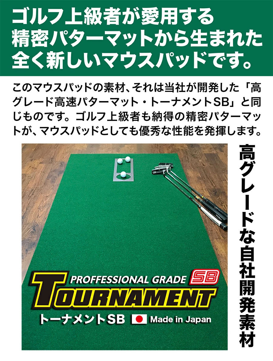 「SUPER-BENT」の系譜となる新・高速グリーンがここに完成。 TOURNAMENT-SB(トーナメントSB)。 SUPER-BENTの標準スピードに対して、TOURNAMENT-SB(トーナメントSB)は名門コース・トーナメントコースをイメージした高速グリーンです。 スティンプメーターに置き換えた相対値(S指数)ではSUPER-BENT:順目9ft、逆目8ft に対してTOURNAMENT-SB(トーナメントSB):順目12ft、逆目10ft。 順目方向に打つと、ボールが高速ラインを流れていく感覚。 難易度は高くともスリリングかつ心地の良い体験をすることができます。 逆目方向でも10ftあり高速グリーンのスピードのバリエーションが味わえます。 SUPER-BENTの開発時にコンセプトとした「本芝再現」。 それは柔らかいベント芝が多様な方向にカールして、密度が濃く、互いに絡み合って寝ている、自然の芝を日本の繊維技術で再現したパッティンググリーンです。 TOURNAMENT-SB(トーナメントSB)は、その系譜・技術を受け継ぎながら、高速グリーンとして刈高を下げ、繊維本数を大幅に増やして密度を上げ、さらに特殊な処理で繊維を収縮させて「緻密」なグリーンとして高速化を行いました。 これを我々は「鍛え上げた高速グリーン」と表現しています。 裏面は凸凹が少なくフラットなバッキングラバーで床への密着を図っています。 「SUPER-BENT」の系譜、新・高速グリーン、トーナメントSB。 以下のようなユーザー様を想定した製品です。 ・基本を踏まえ、さらにパット上達を目指す方 ・速いグリーンでプレーされる方 ・ゴルフ練習施設やプロショップのオーナー様 ・ツアープロや、競技ゴルファー様 ゴルフを深く理解し愛する皆様に、大きな満足感をもたらすアイテムとなるはずです。 パット上達の新しいステージとして毎日お使いください。 ※コースグリーンの●●フィートとは「平たんな場所」の平均値であり、実際のパットは様々なスピードであることは要注意です。 パターマットのスピードは「S指数」で表示しています。 【加工について】加工場所:高知市/加工工程:トムソン加工