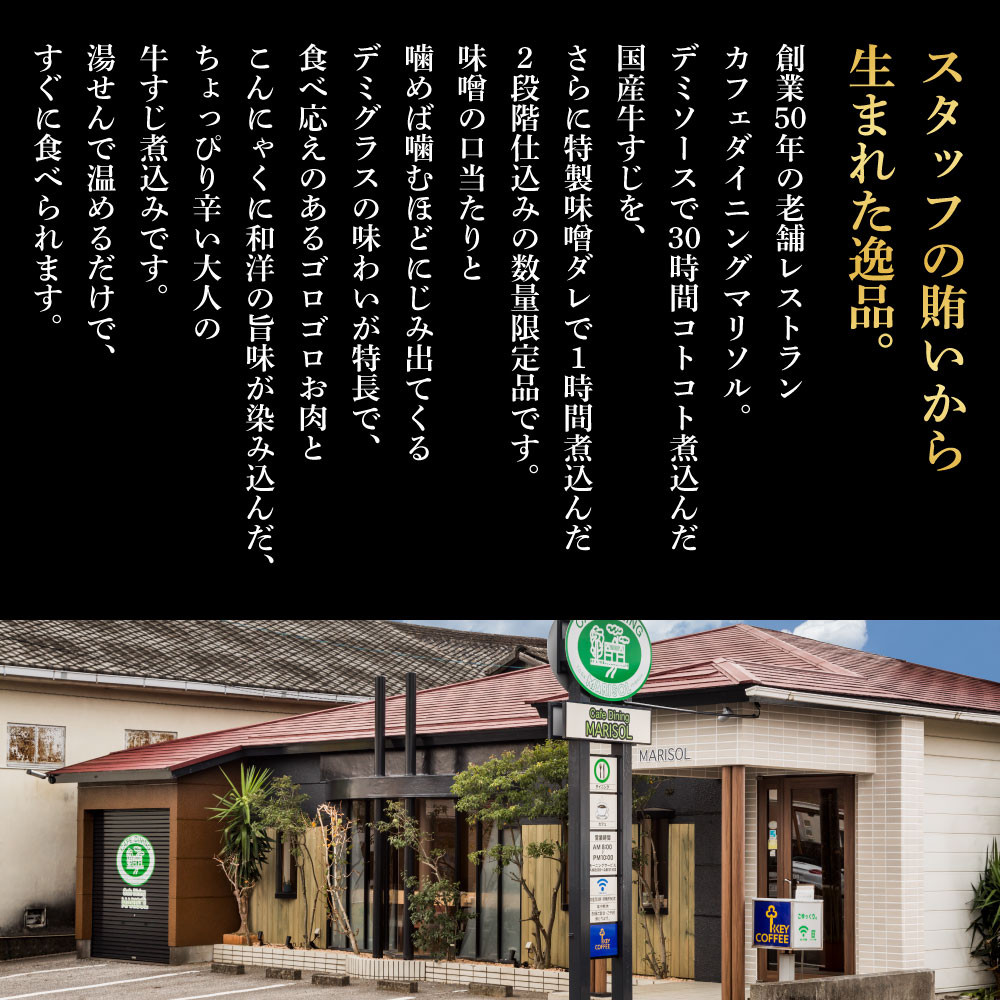 デミソースで30時間コトコト煮込んだ国産牛すじを、さらに特製味噌ダレで1時間煮込んだ2段階仕込みの数量限定品です。